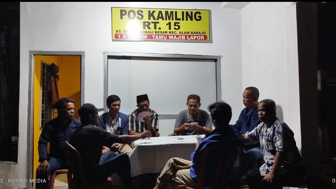 Kota Jambi, Beritakotanews.id : Suasana keakraban tampak di Pos Kamling RT 15, Kelurahan Kenali Besar, Kecamatan Alam Barajo, Kota Jambi, pada Rabu (8/10/2025) malam. Warga terlihat duduk santai sambil bermain kartu remi, namun bukan sekadar untuk hiburan—melainkan sambil menjaga keamanan lingkungan.