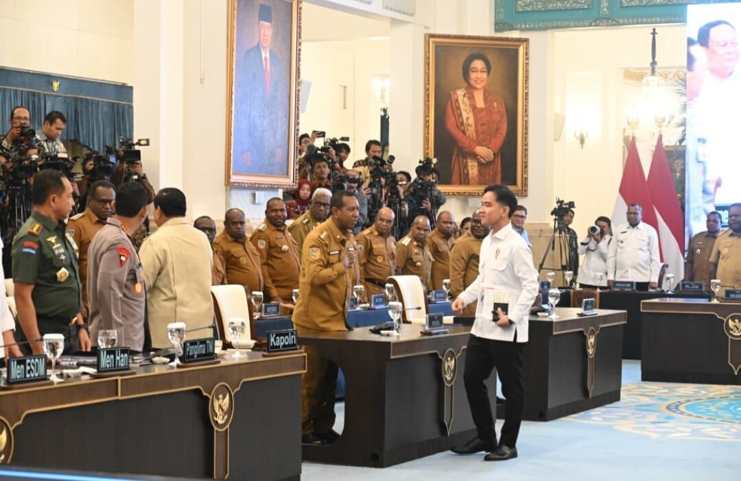 Jakarta, Beritakotanews.id : Wakil Presiden (Wapres) Gibran Rakabuming mendampingi Presiden Prabowo Subianto memberikan pengarahan kepada para Kepala Daerah se-Papua serta Komite Eksekutif Percepatan Pembangunan Otonomi Khusus Papua di Istana Negara, Jakarta, Selasa (16/12/2025). Pengarahan ini menegaskan komitmen pemerintah pusat dalam mempercepat pembangunan Papua sebagai bagian dari agenda pemerataan nasional.