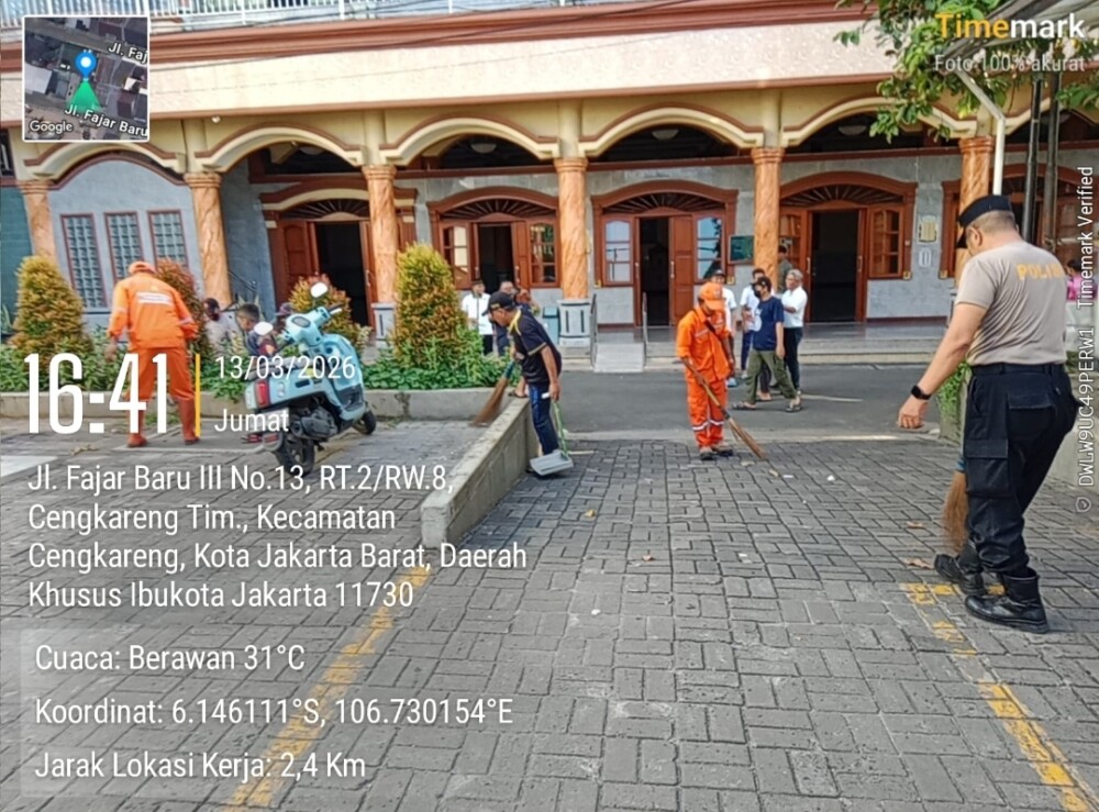 Kegiatan Kurvei dengan bersih-bersih lingkungan masjid tersebut yang berlangsung pada Jumat, 13/3/2026 diikuti oleh 50an peserta gabungan dari Polri, Pol PP, TNI, PPSU dan warga sekitar dipimpin langsung oleh Wakapolsek Cengkareng, AKP H.Munadi.