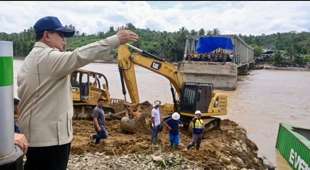 Setibanya di lokasi, Presiden Prabowo langsung meninjau titik konstruksi yang berada tepat di tepi aliran sungai. Presiden menyaksikan dari dekat operasi alat berat, mulai dari ekskavator hingga loader yang bekerja tanpa henti memperkuat pondasi dan timbunan batu gajah sebagai oprit jembatan.