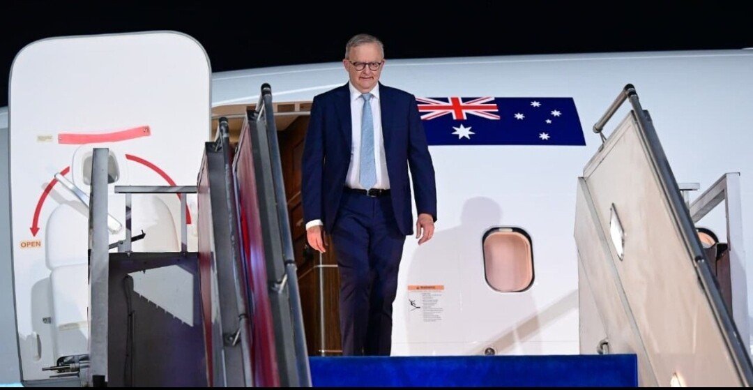 Prosesi penyambutan berlangsung khidmat dengan kehadiran pasukan jajar kehormatan yang berdiri tegap di sepanjang jalur penyambutan menuju kendaraan resmi. Suasana semakin semarak ketika PM Albanese melangkah melewati barisan kehormatan dengan iringan musik drumben, menandai penghormatan resmi bagi kepala pemerintahan negara sahabat.