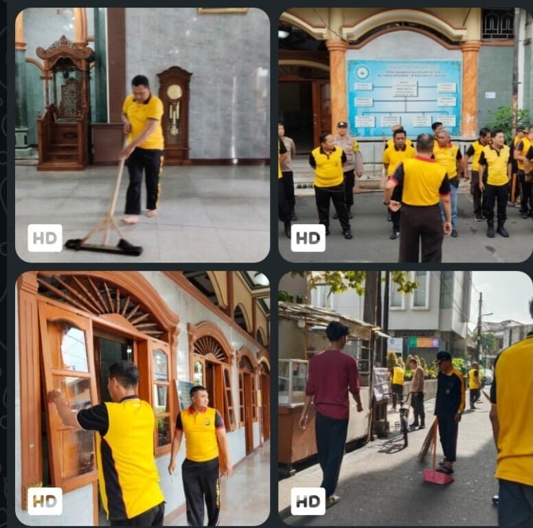 Ngepel lantai masjid dan bersih-bersih lingkungan oleh jajaran Polsek Cengkareng di Masjid LDII dan Ponpes Baitul Muttaqin tersebut dalam rangka memperingati Isra Mi’raj Nabi Besar Muhammad SAW 1447 H/2026,.