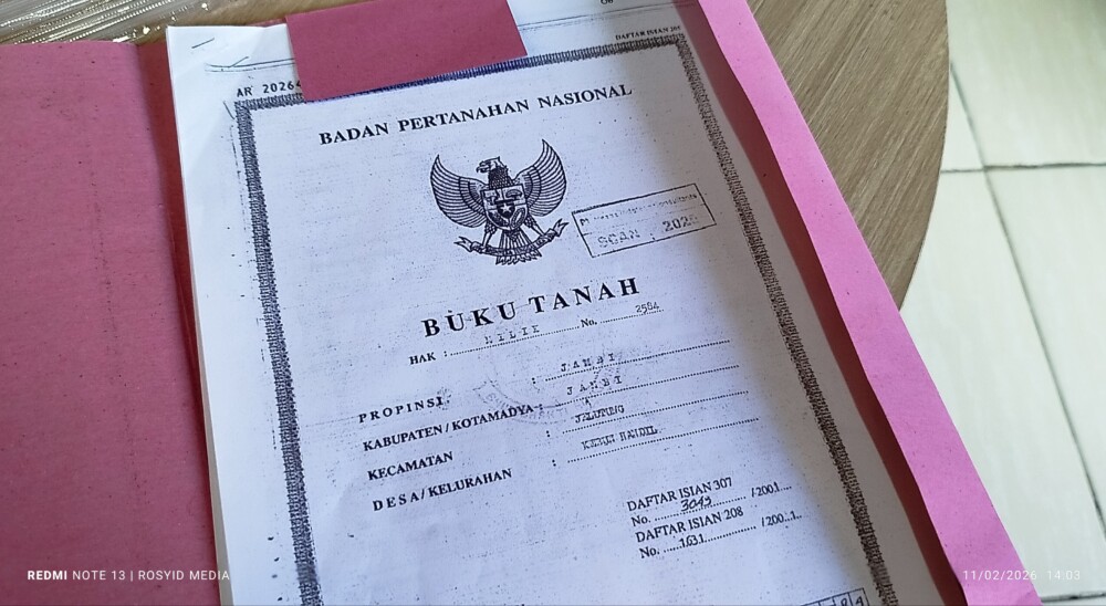 Sertifikat tersebut tercatat memiliki luas tanah 1.393 meter persegi dan berlokasi di Kelurahan Handil, Kecamatan Jelutung, Kota Jambi, Provinsi Jambi. Dokumen itu atas nama Haji Nazrin Nurnin, sebagaimana dikuatkan dengan Surat Keterangan Beda Nama dari Kelurahan Pematang Sulur Kecamatan Telanaipura Kota Jambi Nomor 474/06/PS/2026.