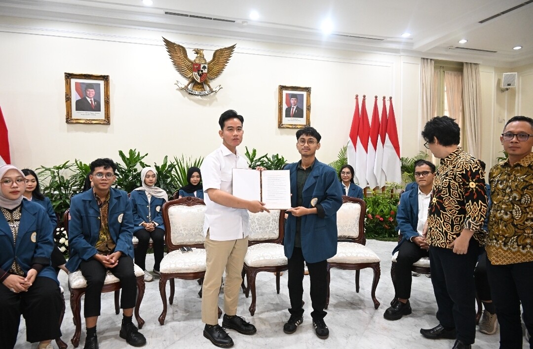Jakarta, Beritakotanews.id : Wakil Presiden (Wapres) Gibran Rakabuming menunjukkan keterbukaan pemerintahan Presiden Prabowo Subianto terhadap suara generasi muda dengan menerima langsung Asta Tuntutan Mahasiswa Universitas Airlangga (Unair) November 2025 yang berisi sejumlah butir aspirasi, di Istana Wapres, Jakarta Pusat, Kamis (06/11/2025).